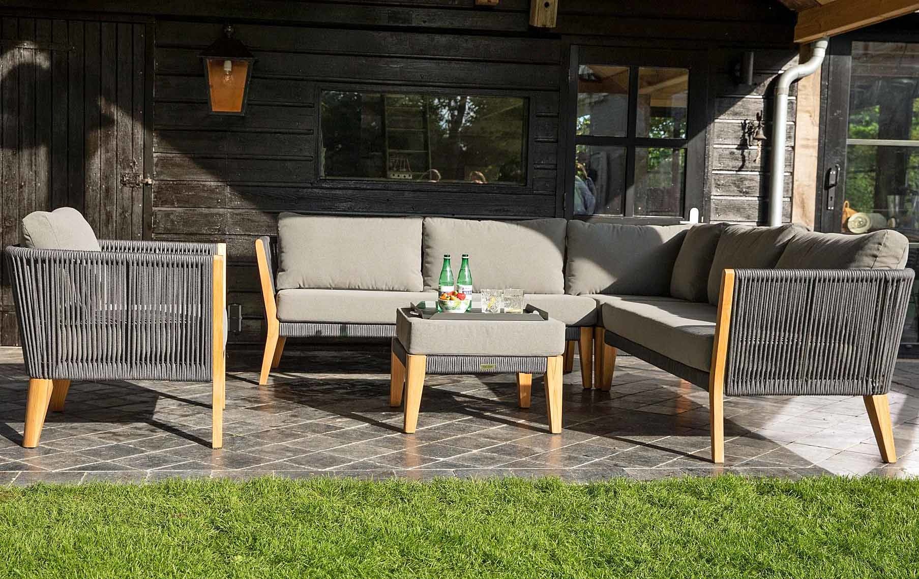 De trend van dit tuinmeubel seizoen, dat is dit comfortabele lounge tuinset ‘San Remo’ van Exotan. Bijzonder hip is de afwerking met het UV-bestendige, sterke en kleurvaste rope (luxe nylondraad). De set staat op stevige teakhouten vintage gevormde poten.